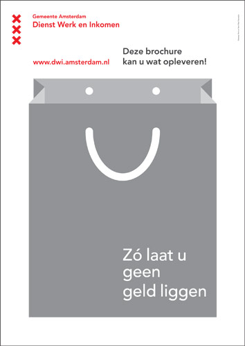 Lachende boodschappentas moet Amsterdammers met een laag inkomen verleiden tot het lezen van de brochure 'Zó laat u geen geld liggen'. Affiche in opdracht van de Dienst Werk en Inkomen. |