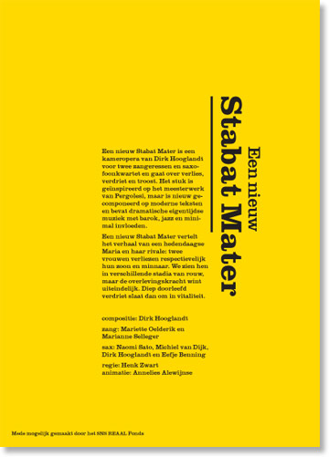![]() Affiche Een nieuw Stabat Mater![]() ![]() Een nieuw Stabat Mater is een kameropera voor zang en saxofoon. Het stuk is geïnspireerd op het meesterwerk van Pergolesi, maar is nieuw gecomponeerd op moderne teksten en bevat dramatische eigentijdse muziek met barok, jazz en minimal invloeden. |