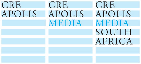 ![]() Nieuwe identiteit voor Creapolis Media![]() ![]() en simulaties ter ondersteuning van training, opleiding, coaching, communicatie en HRM-processen. Door de oprichting van een vestiging van Creapolis Media in Zuid Afrika ontstond de behoefte aan een nieuwe visuele identiteit. Als basis voor de identiteit heeft Vorm en Vent gekozen voor een eenvoudig grid en een klassieke letter. Het grid biedt de mogelijkheid tot implementatie van nieuwe vestigingen. De letter Garamond, gezet in kapitalen, ondersteunt de klassieke toon in de naam Creapolis en accentueert de academische achtergrond van de medewerkers. |